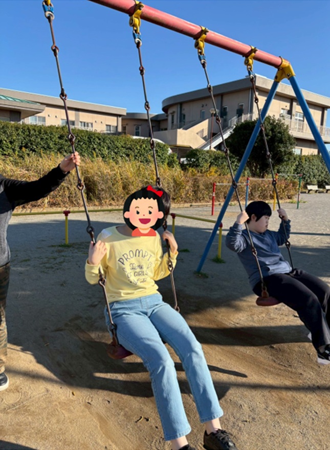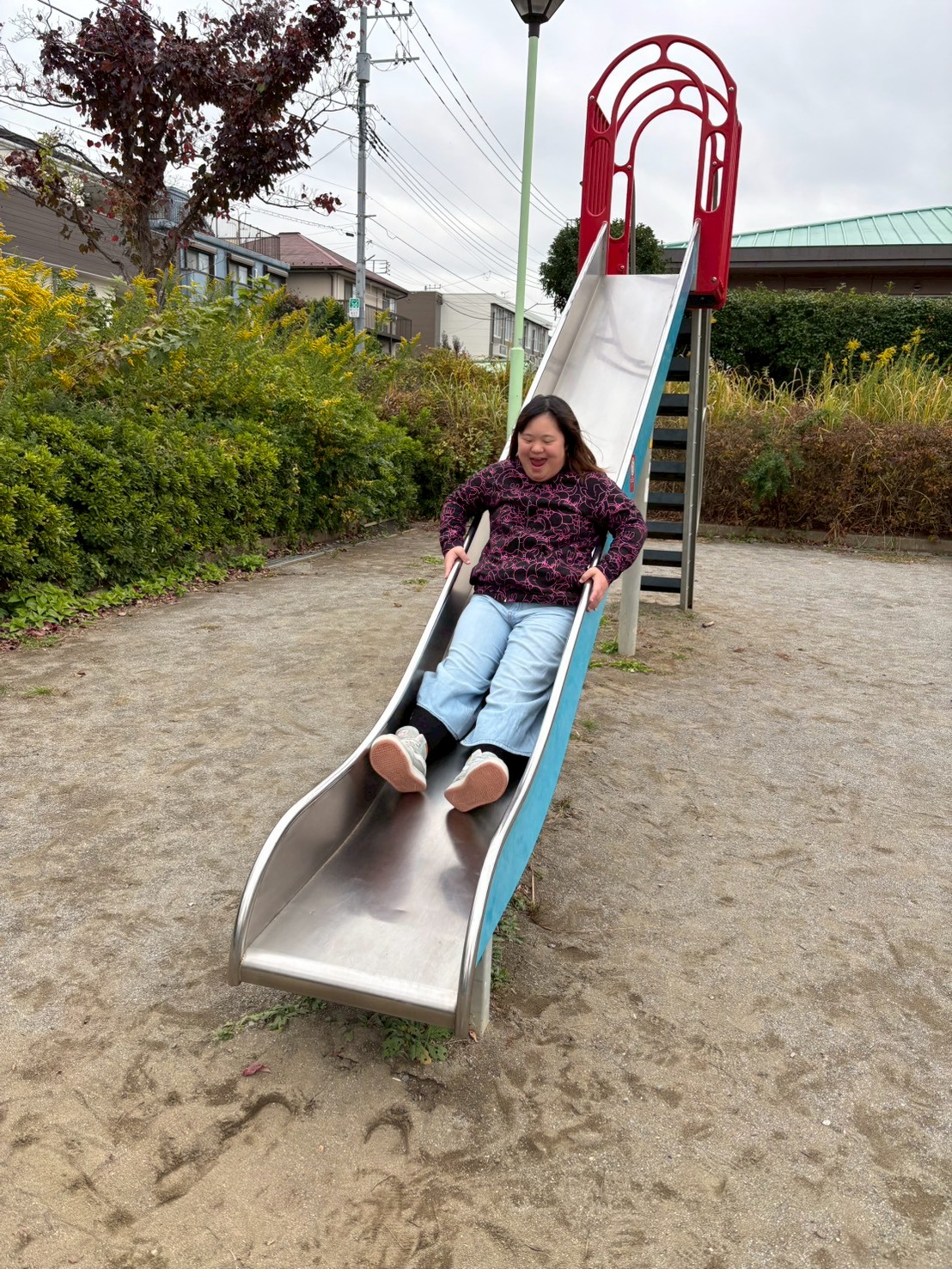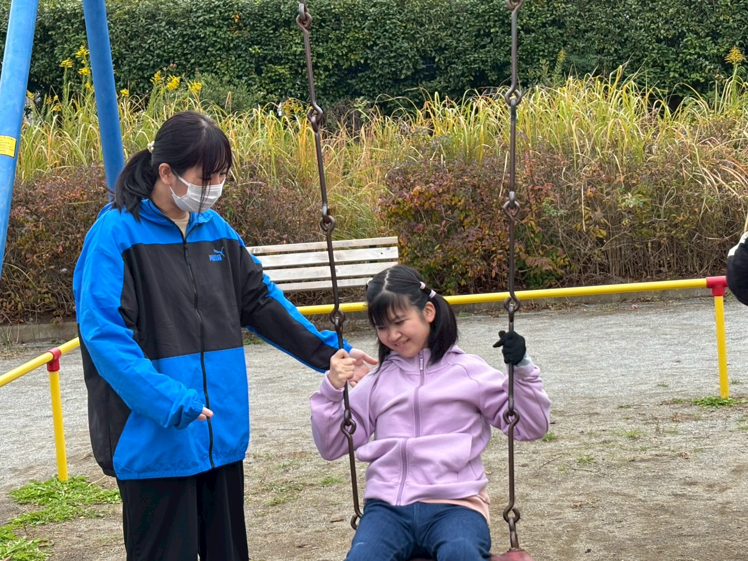 ブランコにゆられたり、すべり台をニコニコで滑ったり、鉄棒につかまってスタッフと一緒にポーズを決めたりと、冬の外遊びとは思えないほど元気いっぱい! 「見て見て〜!」「もう一回やる!」という声が飛び交い、外の空気の中で自然と笑顔が広がりました。