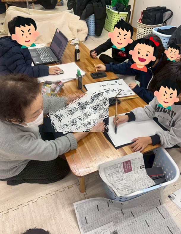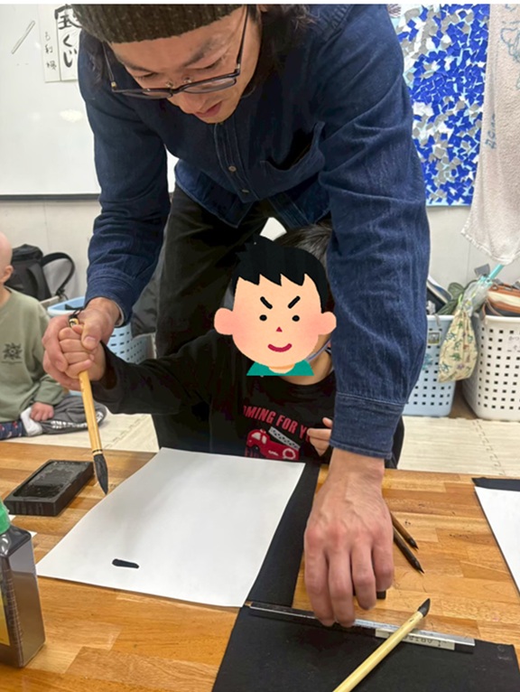 スタッフに手を添えてもらいながら筆を持ち、ゆっくりと一文字ずつ書いていきます。