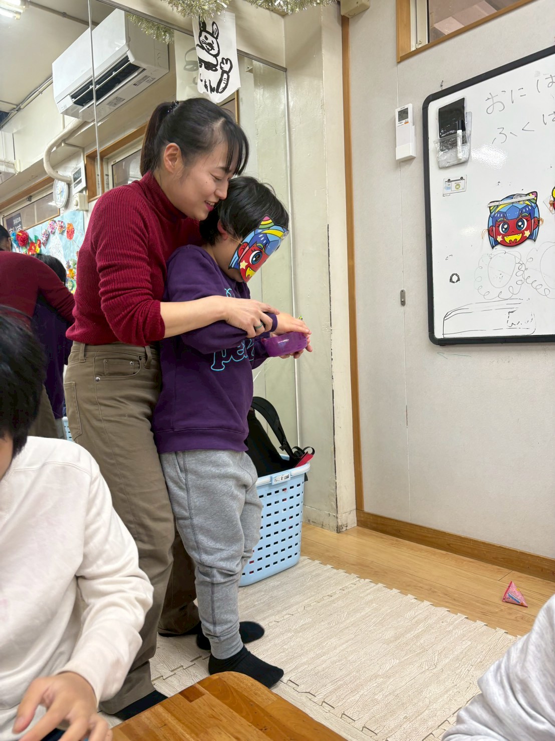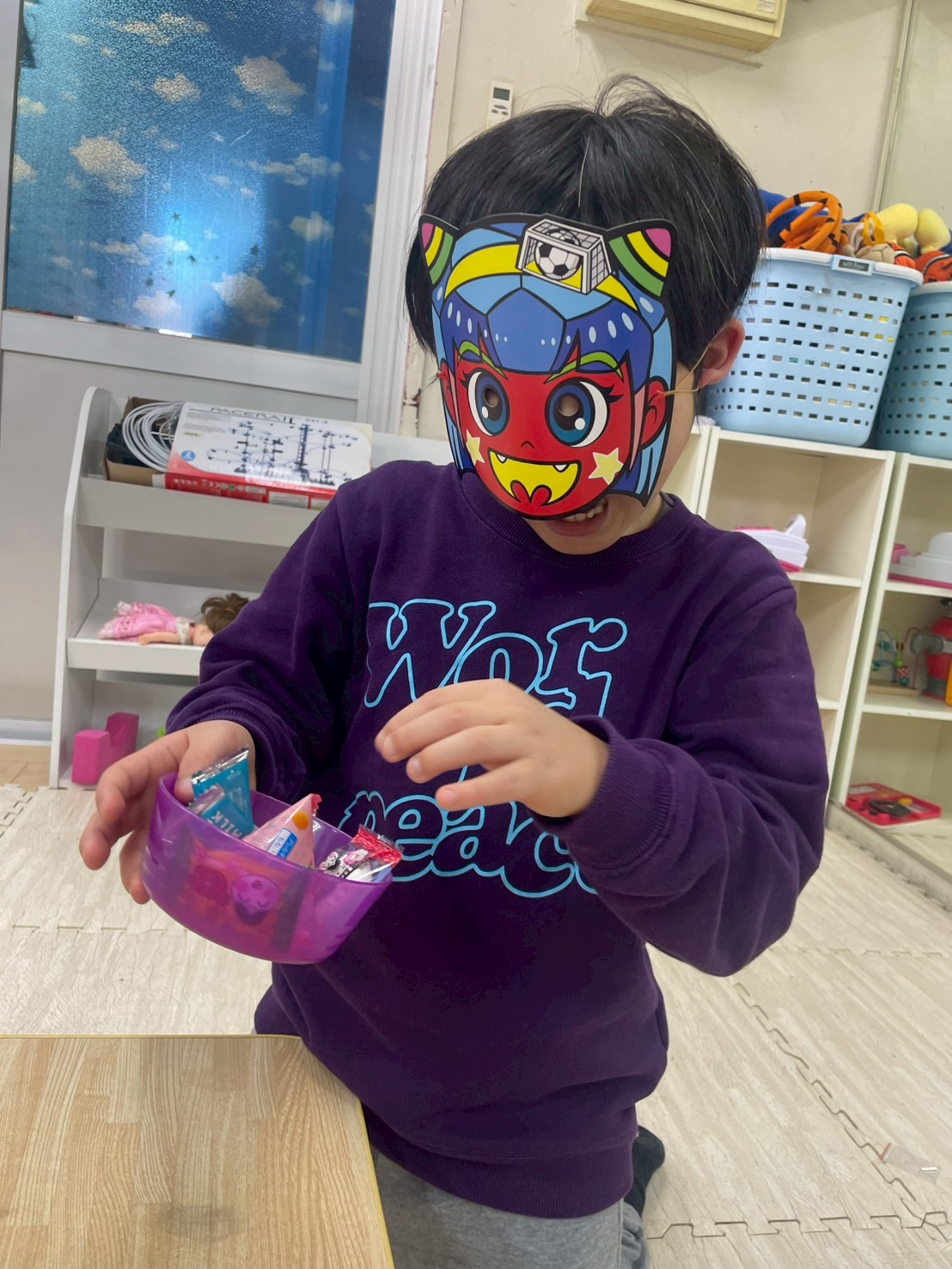 鬼のお面をつけて参加したり、豆まきに見立てた遊びをしたりと、季節の行事を楽しみました。